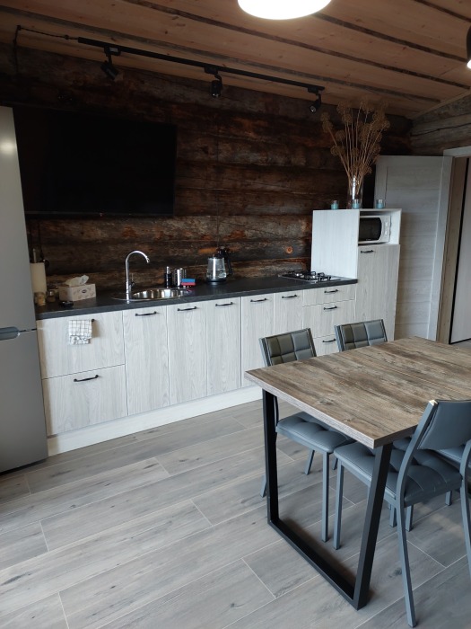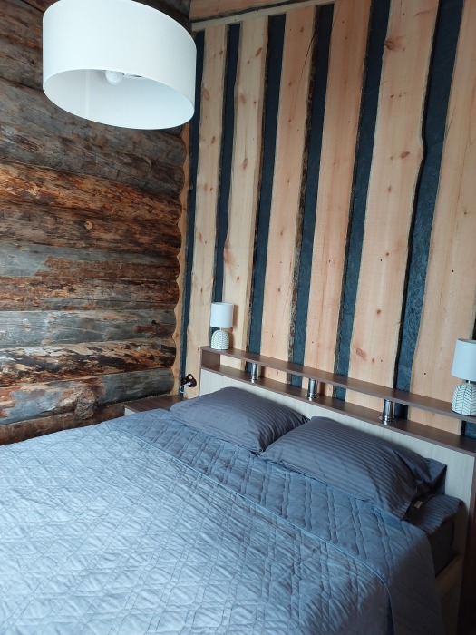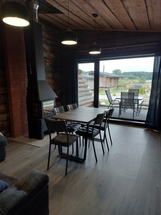 В кухне-гостиной большое окно с видом на лес, обеденный стол, дровяной камин, удобный раскладной диван. Большая двуспальная кровать в спальне. Терраса с деревянной мебелью для созерцательного отдыха на свежем воздухе.