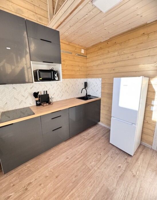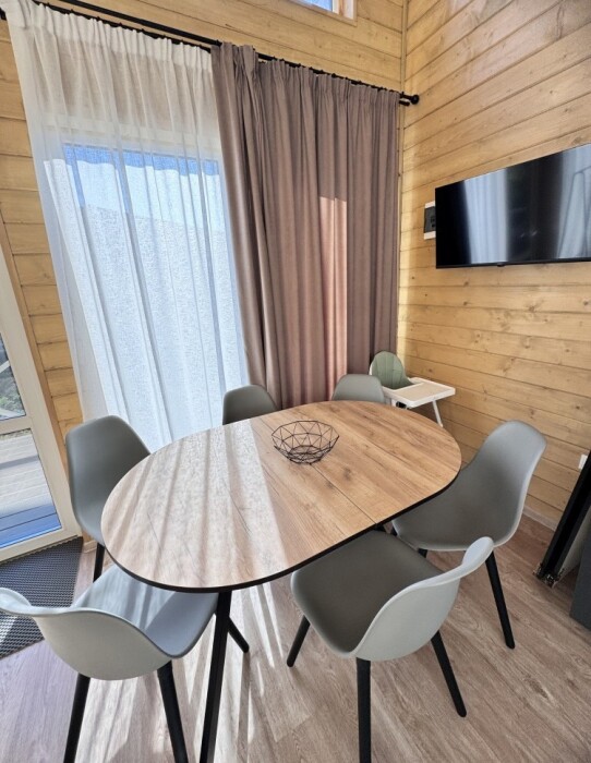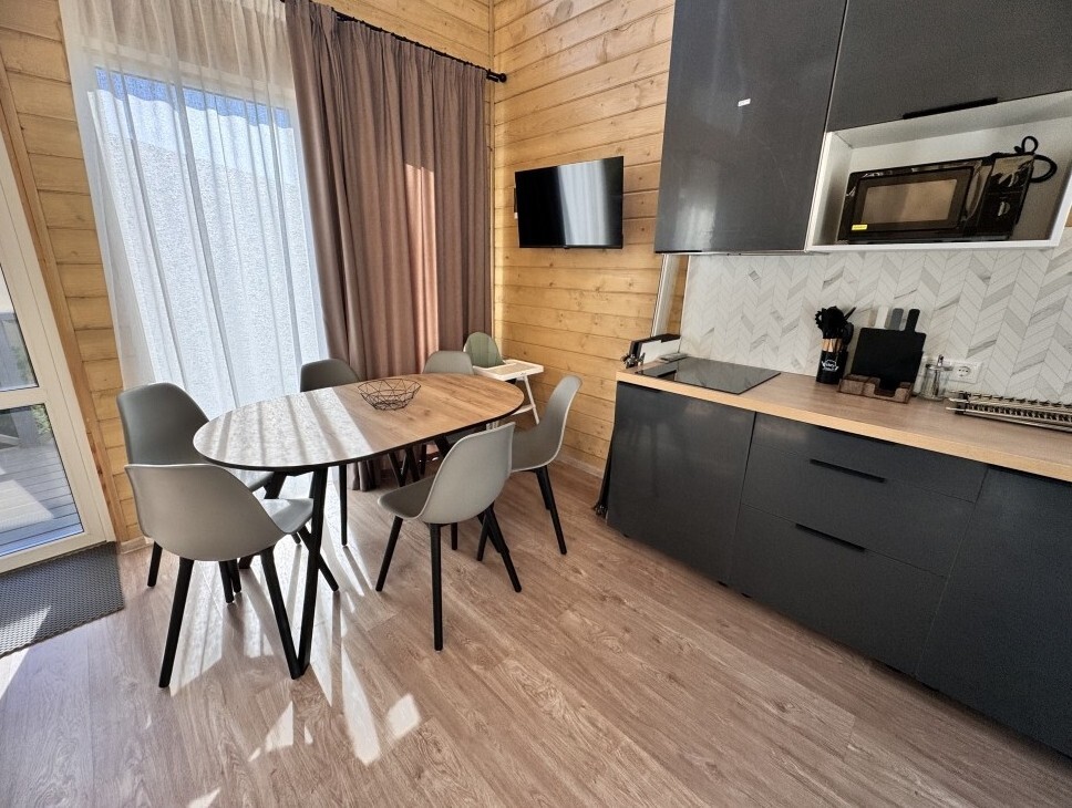Просторная гостиная-кухня: полноценно оборудованная кухня с необходимой техникой и посудой. Большой обеденный стол для общих трапез.