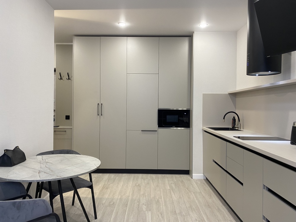 - Кухня с холодильником, варочной панелью, микроволновой печью.
