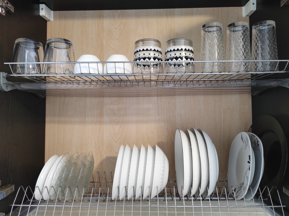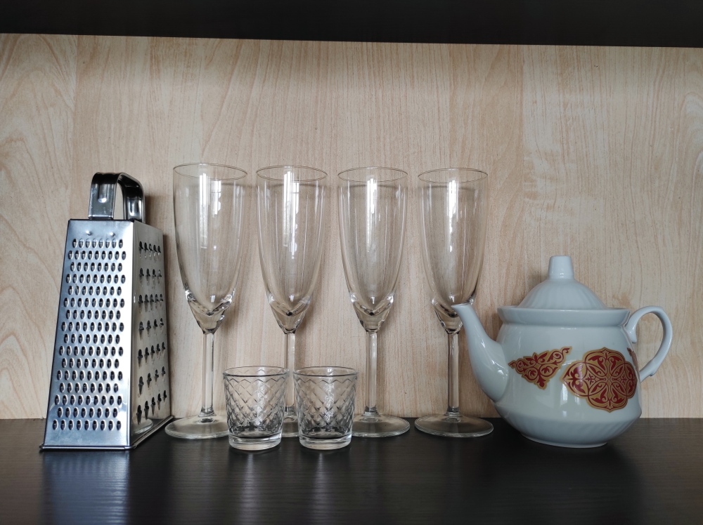 Полностью оборудованная кухня: плита, посуда, микроволновка, чайник, холодильник.