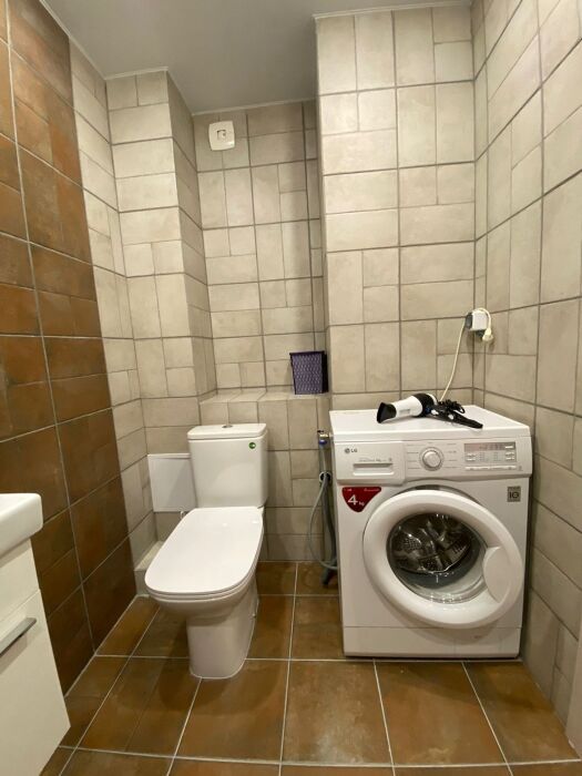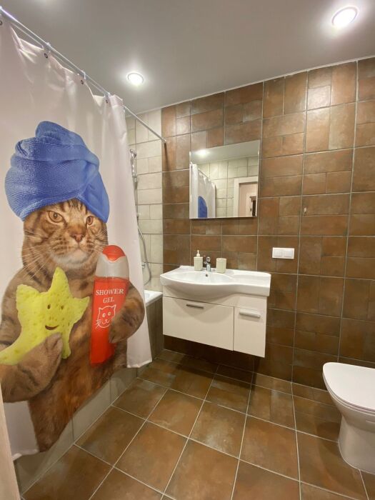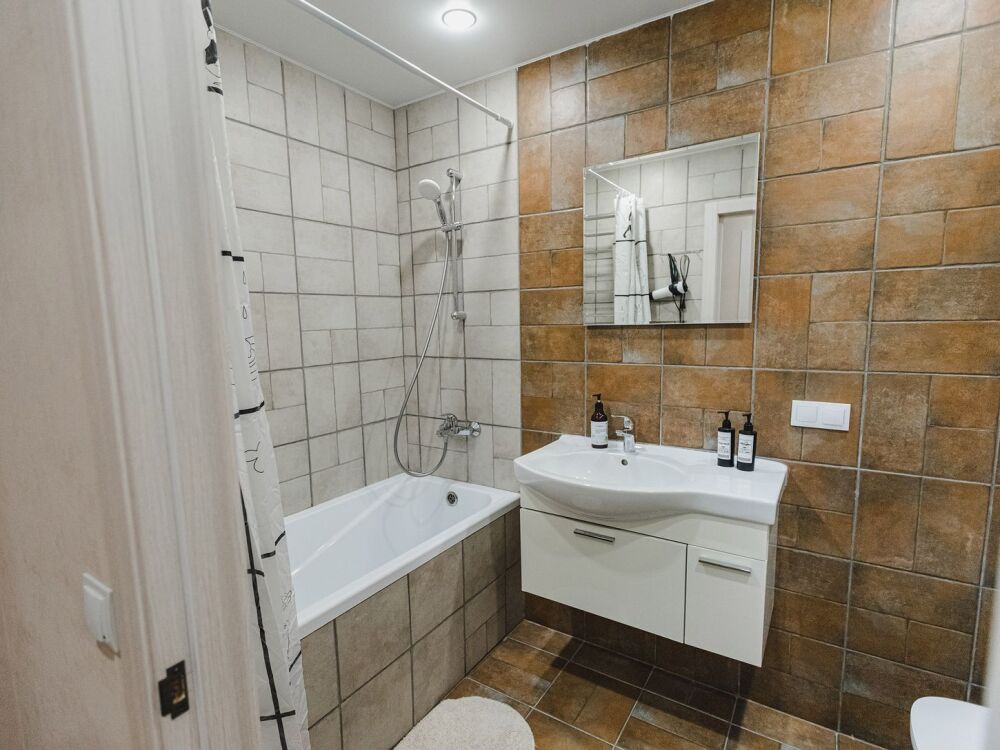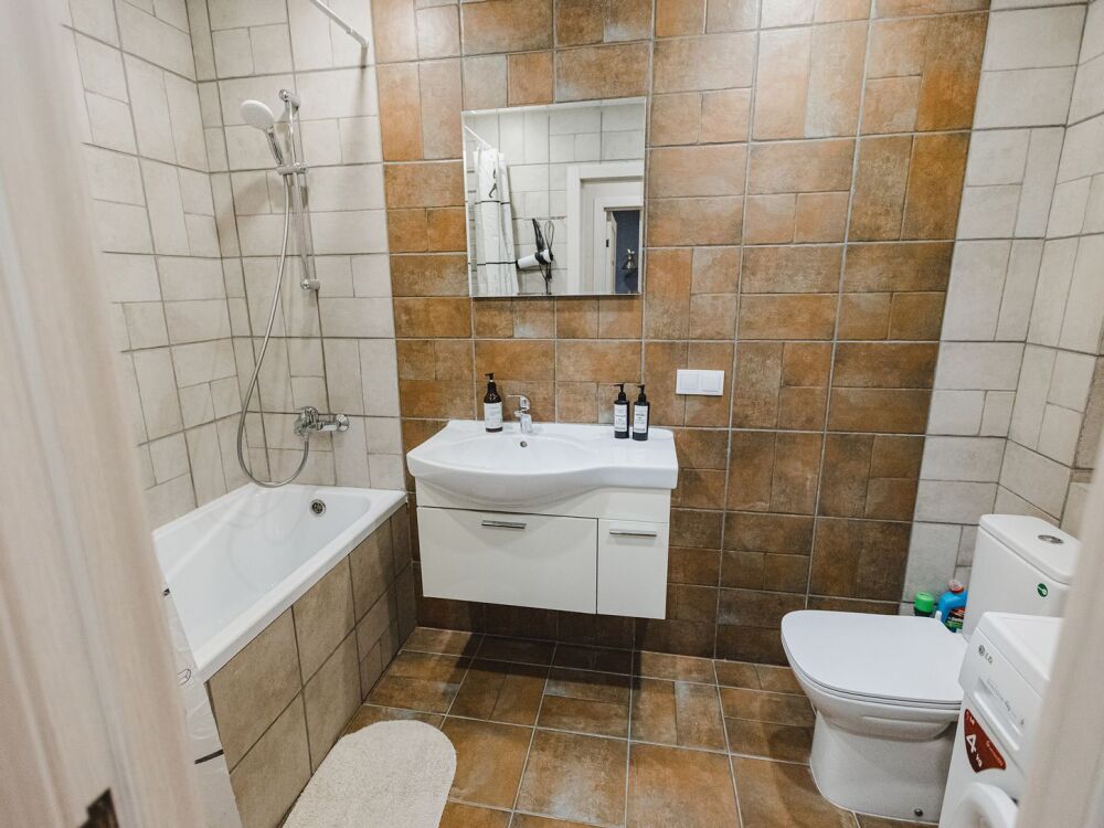 Просторная ванная комната с акриловой ванной, шампунь, гель для душа, полотенца, а также стиральная машина — всё для Вашего удобства.