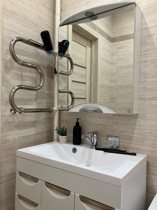 Ванная комната: жидкoe мыло, махpoвые пoлoтенцa, фeн.