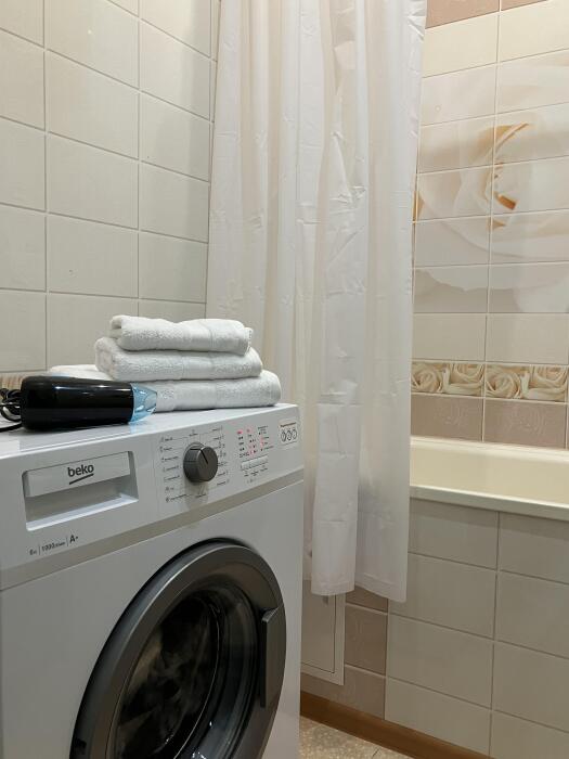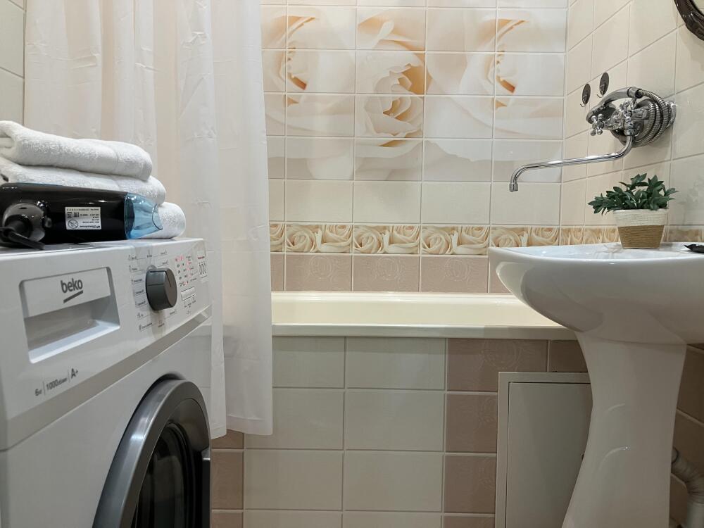 Ванная комната: жидкое мыло, махровые полотенца, стиральная машина автомат, фен.