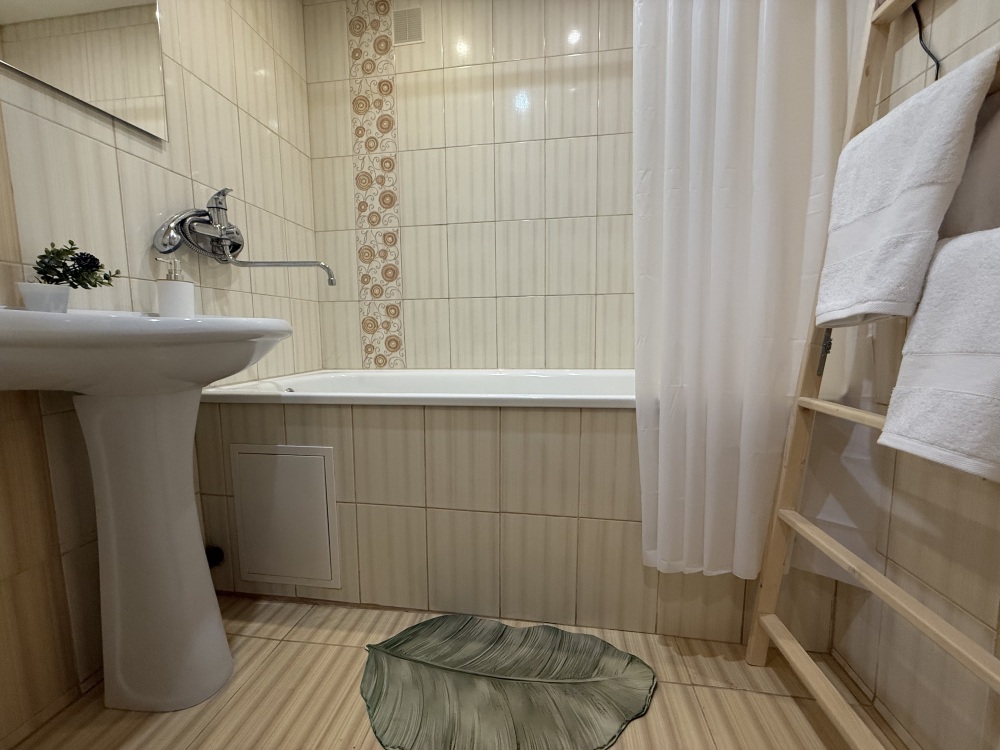 Ванная комната с ванной укомплектована махровыми полотенцами и жидким мылом.