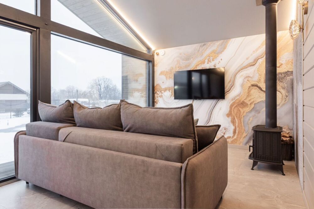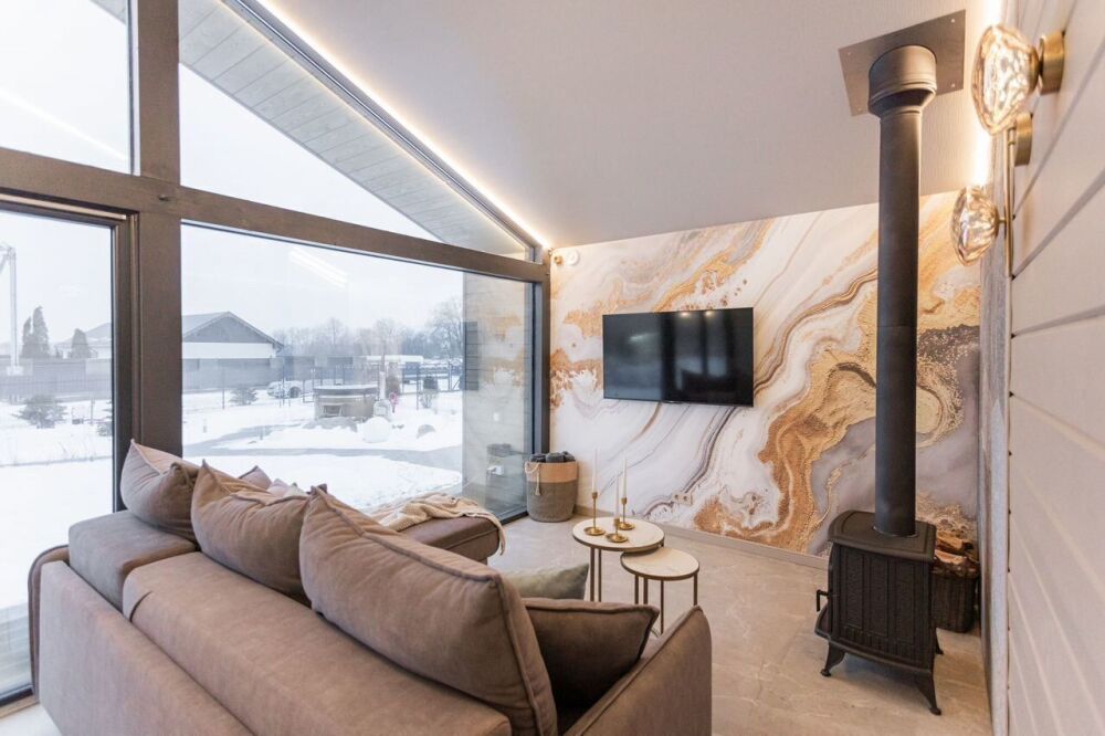 Горячая купель под открытым небом, панорамное остекление, природный сад, утопающий в цветах, костровая зона, солярий с шезлонгами и просторная терраса - всё только для Вас.