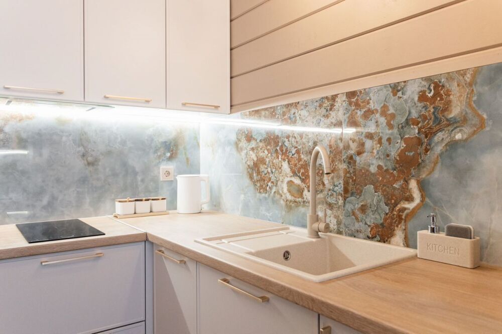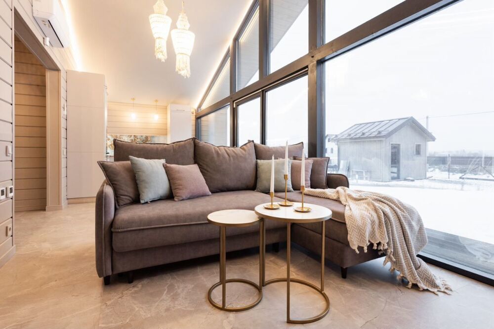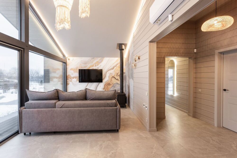 Большая кухня-гостиная с диваном-кроватью.