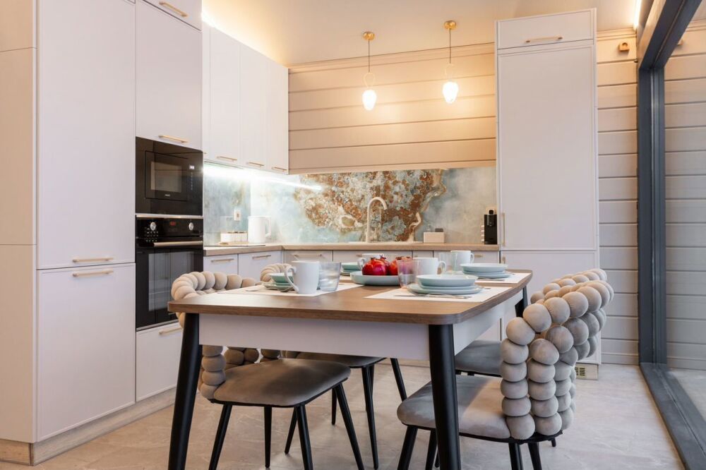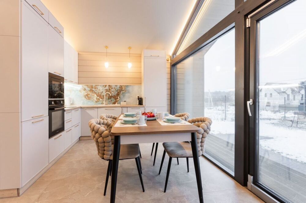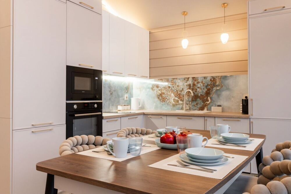 Полностью оборудованная кухня: духовка, кофемашина, индукционная плита, СВЧ, посудомоечная машина, холодильник, морозильник.