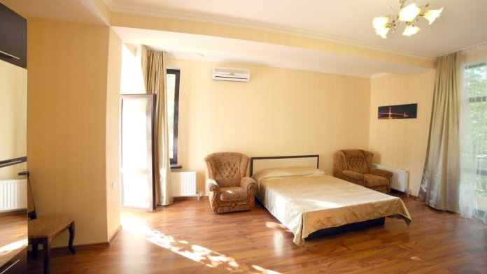 Номера сочетают в себе практичность и продуманность каждой детали, и предназначены для комфортного семейного отдыха. В номере предусмотрен спальный гарнитур, телевизор, раскладной диван и кресло, которое по необходимости можно разложить в дополнительное спальное место, а также журнальный столик со стульями. В прихожей есть удобная вешалка, тумба для обуви и пляжных принадлежностей. В стоимость включено 3-разовое питание.