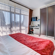 В номере: двуспальная кровать, прикроватные тумбочки, шкаф-купе, стол, стулья, кухонный уголок, вешалка, зеркало, кондиционер, теплые полы (зимой), сейф, телевизор ЖК, мини-холодильник, микроволновая печь, чайник, набор посуды, пляжные полотенца, санузел с душевой кабиной, фен, туалетные принадлежности, тапочки, балкона нет, вид из номера на город и парк, wi-fi, телефонная связь по территории отеля.