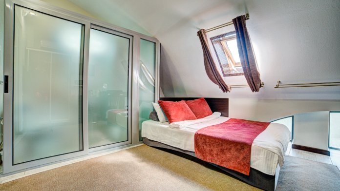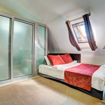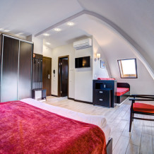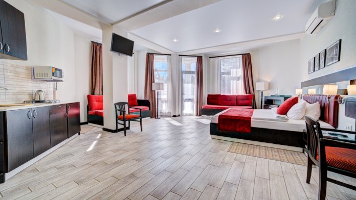 В номере: двуспальная кровать, прикроватные тумбочки, тахта, шкаф-купе, стол, стулья, кухонный уголок, вешалка, зеркало, кондиционер, теплые полы (зимой), сейф, телевизор ЖК, стиральная машина, холодильник, микроволновая печь, мини-кухня (двухкомфорочная газовая плита), чайник, набор посуды, пляжные полотенца, санузел с душевой кабиной, фен, туалетные принадлежности, тапочки, балкона нет, вид из номера на город и парк, wi-fi, телефонная связь по территории отеля.
