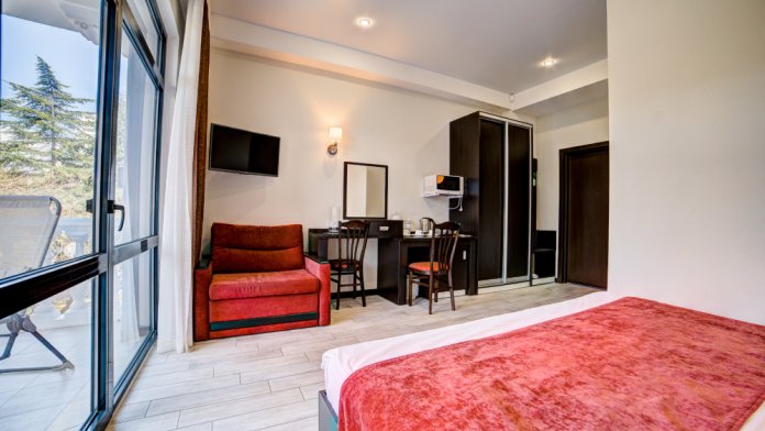 В номере: 2 полуторные кровати, прикроватные тумбочки, тахта, шкаф-купе, стол, стулья, кухонный уголок, вешалка, зеркало, кондиционер, теплые полы (зимой), сейф, телевизор ЖК, мини-холодильник, микроволновая печь, чайник, набор посуды, пляжные полотенца, санузел с душевой кабиной, фен, туалетные принадлежности, тапочки, балкон оборудован мебелью, вид из номера на город и парк, wi-fi, телефонная связь по территории отеля.