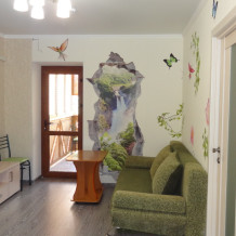 Комфортный номер с мини-кухней и гостевой зоной с диван-кроватью, а также с двумя отдельными спальными комнатами. В одной комнате две односпальные кровати, а в другой комнате три односпальные кровати. Раздельный санузел.