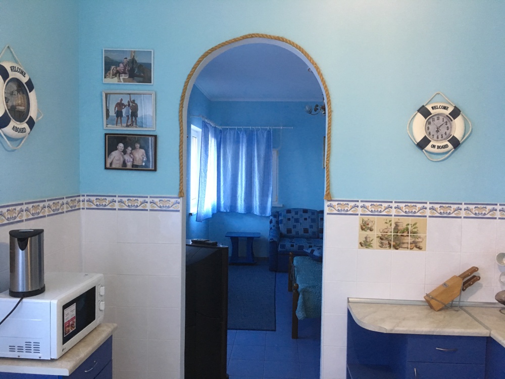 2 комнатный номер люкс =капитанский- номер с индивидуальным дизайном в морской тематике. Имеется большой балкон . Вид на бухту профессорского уголка и виноградники. В составе номера имеется кухня барного типа ( имеется двухкамерный холодильник и микроволновка)- спутниковое тв. Интеренет. Фен . Утюг. Спальные места представлены-2 спальная кровать . Двухспальный евродиван трансформер . 2( два)- двухспальных евродивана .цену уточнять как и возможность бронирования.