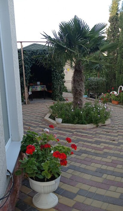 Большой красивый двор,много цветущих и экзотических растений, несколько беседок на территории двора, мангал, стоянка для авто.