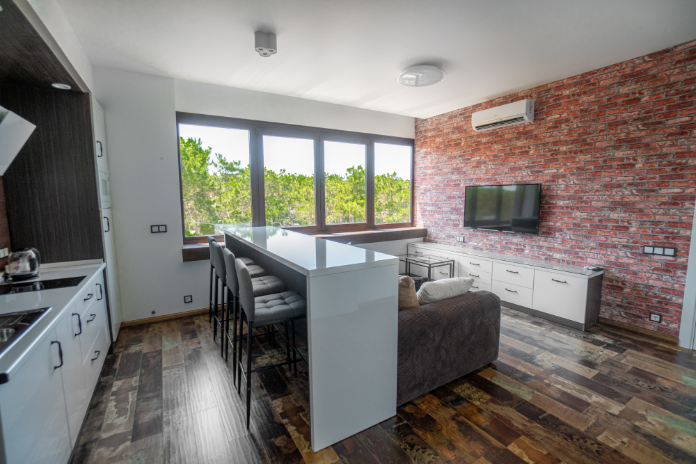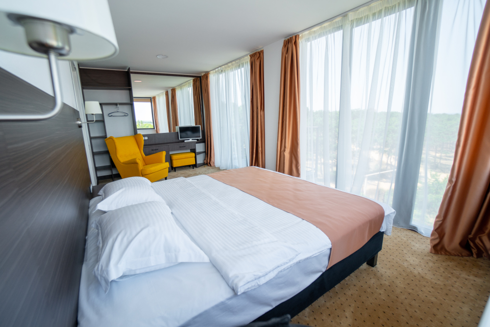 Двухкомнатный номер с понорамными окнами в пол из которых открывается великолепный вид на море.
