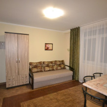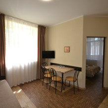 В номере современная и удобная мебель. Кровать с ортопедическим матрацем. Сейф с цифровым замком. Два телевизора LED, цифровое ТВ Т-2 , Wi-Fi. На кухне - двухкамерный холодильник, эл. плита, СВЧ, эл.чайник, вся необходимая посуда и аксессуары.