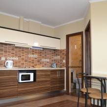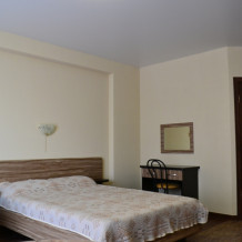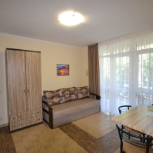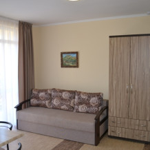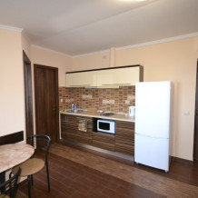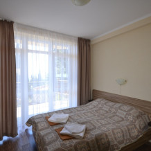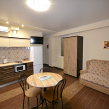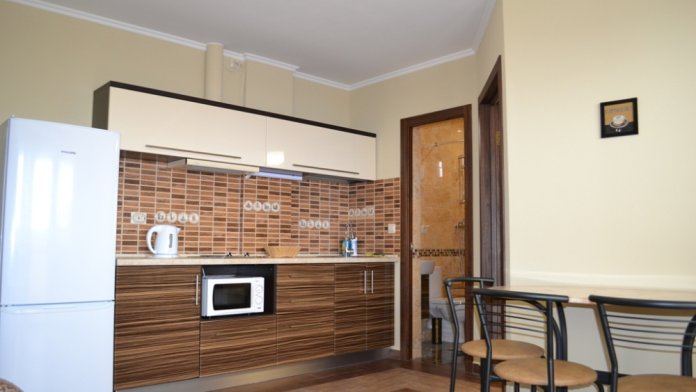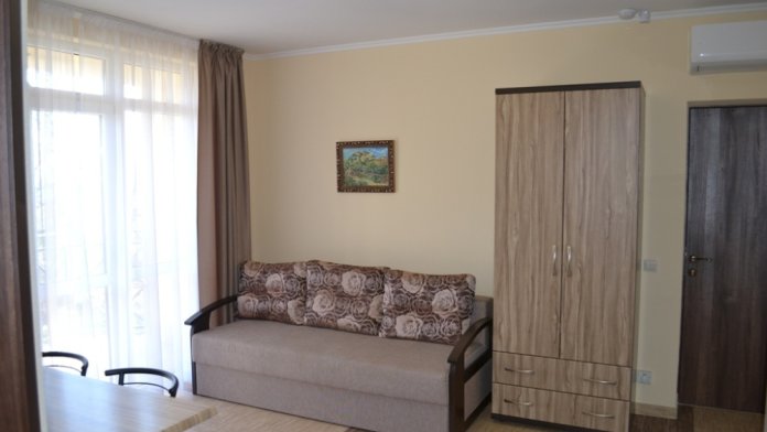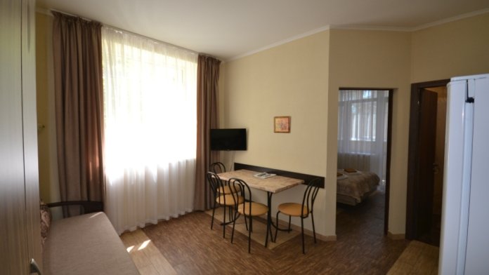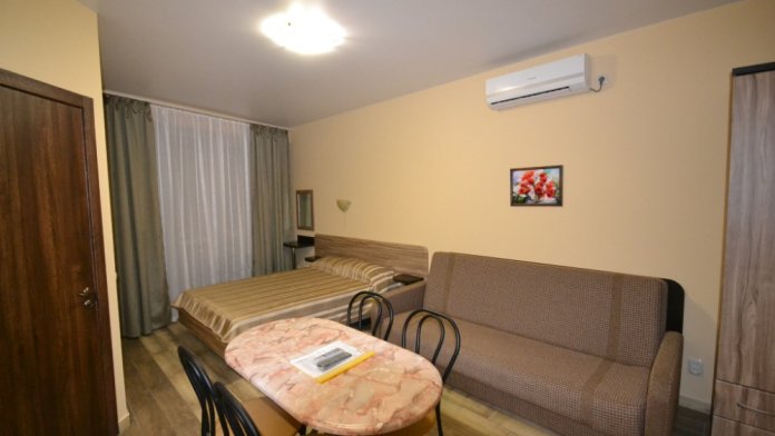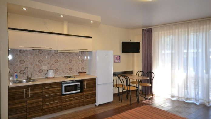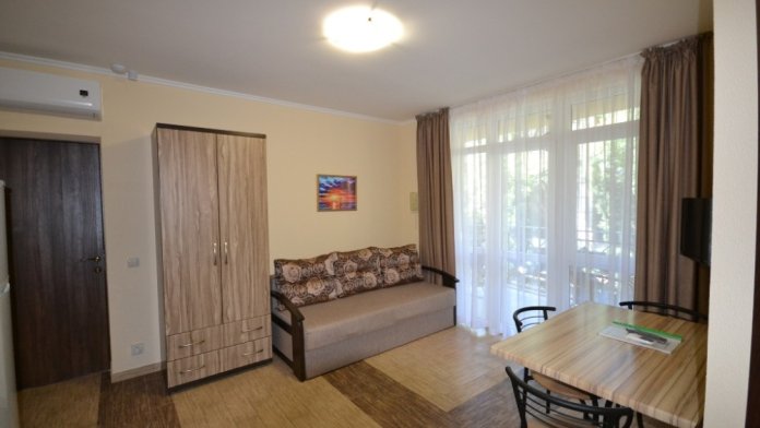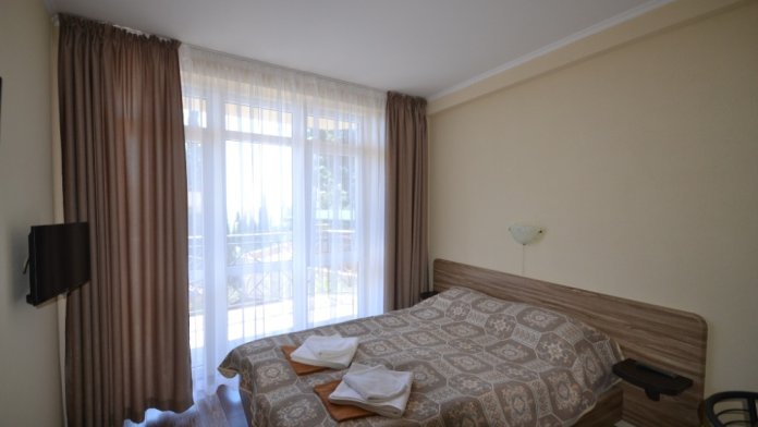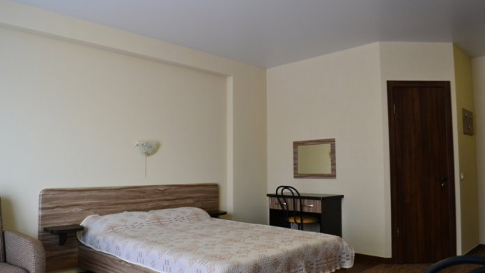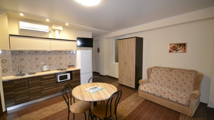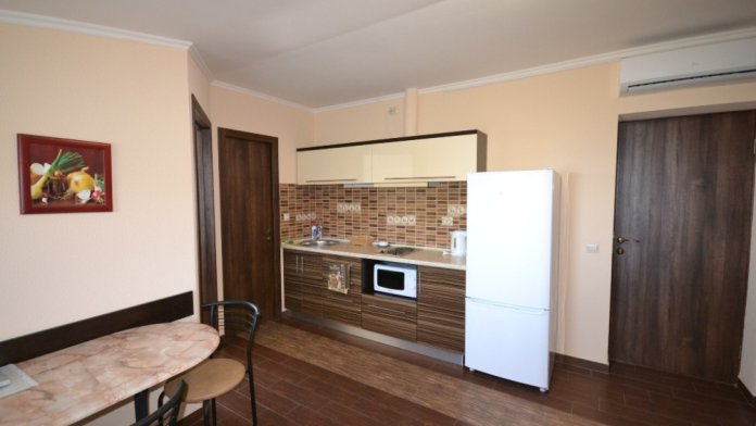 В каждом номере современная и удобная мебель, кровать с ортопедическим матрацем, сейф с цифровым замком, телевизоры LED, цифровое ТВ Т-2. На балконе два плетеных кресла и столик. Кухня оснащена всей необходимой техникой (двухкамерный холодильник, эл. плита, СВЧ, эл.чайник), посудой и аксессуарами. Своевременно производится смена полотенец, постельного белья, и уборка. Удобная планировка и стильное оформление номеров позволят Вам на отдыхе окунуться в атмосферу домашнего уюта и комфорта.