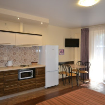 В номере современная и удобная мебель. Кровать с ортопедическим матрацем. Сейф с цифровым замком. Телевизор LED, цифровое ТВ Т-2 , Wi-Fi. На кухне - двухкамерный холодильник , эл. плита, СВЧ, эл.чайник, вся необходимая посуда и аксессуары.