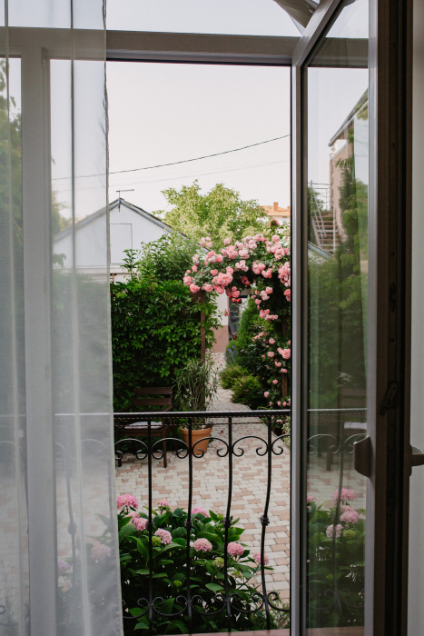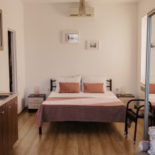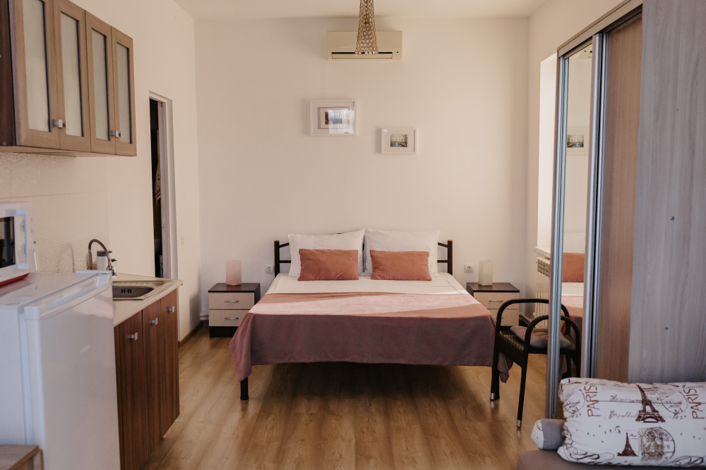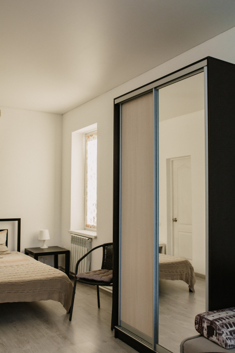 В частном доме «Белый парус» однотипные комнаты повышенной комфортности площадью 24 кв.м. Высота потолков – 2.80 м, полы застелены экологичным ламинатом.