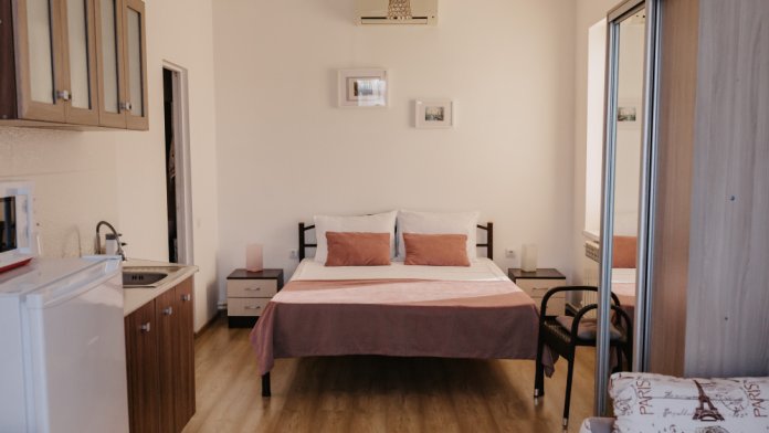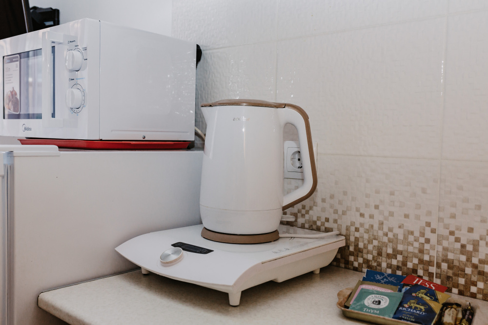 – мини-кухня, холодильник, мойка (хв/гв), микроволновая печь, электрочайник, электрическая или индукционная плита, набор посуды.