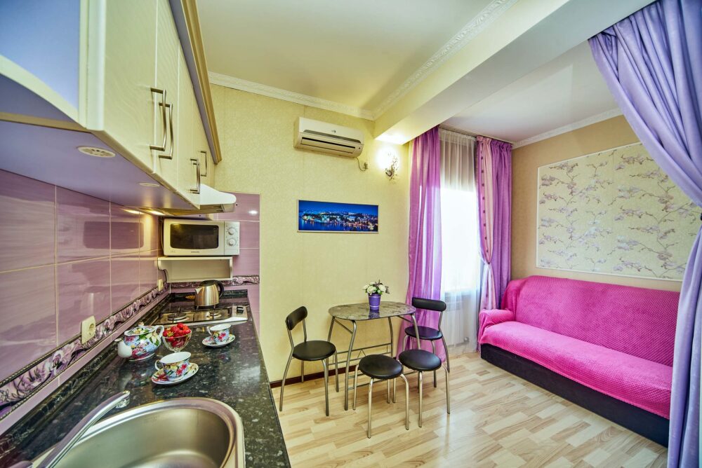 Дизайн-номер с кухней-студио в номере и полноценной возможностью готовить. Выполнен в светлых тонах. Оснащен комфортными спальными местами, платяным шкафом, столом, феном, сейфом, кондиционером, телевизором.
