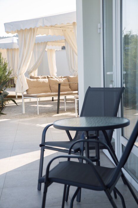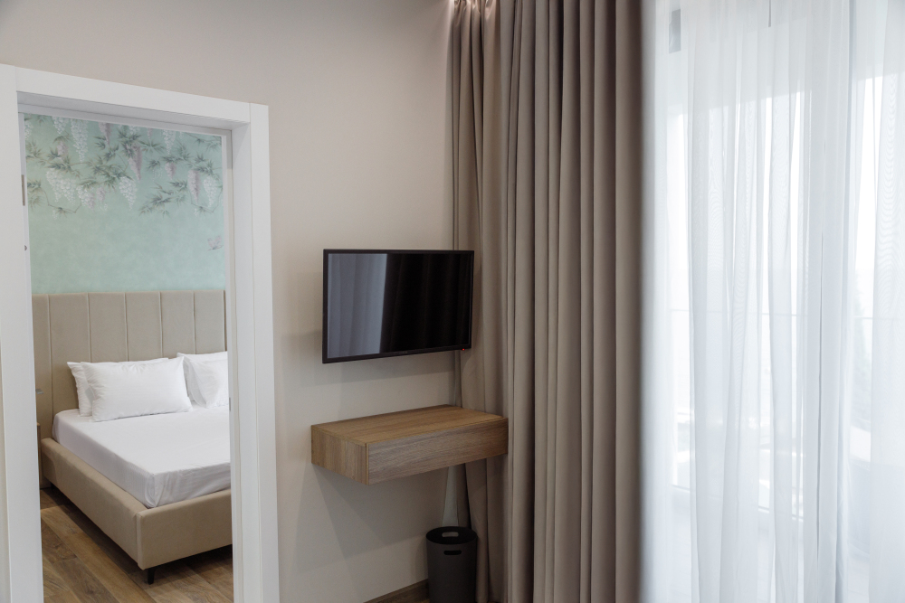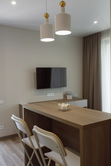 Уютный двухкомнатный просторный номер с гостиной и собственной террасой, панорамным видом на море, расположенный на 1-м этаже корпуса отеля. Оптимальный вариант для троих гостей, семей с детьми или для тех, кто хочет разместиться в более просторном номере