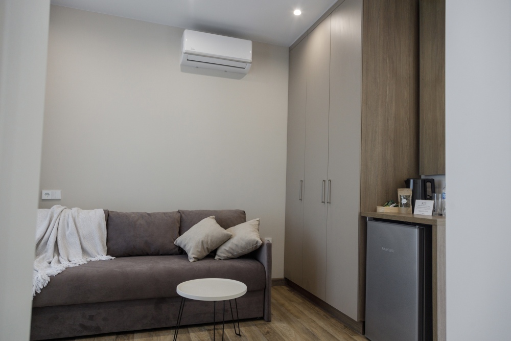 2-спальная кровать (имеются номера с одноместными кроватями), тумбочки, столик, шкаф, кабельное ТВ, стол со стульями (на веранде), холодильник, кондиционер, электро чайник, санузел (душ, унитаз, умывальник), горячая и холодная вода, открытая веранда с видом на море.