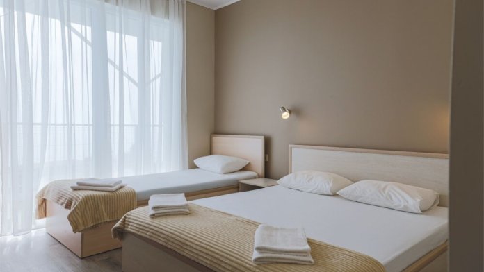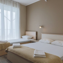 Уютный однокомнатный номер с балконом и панорамным видом на море, расположенный в трехэтажном корпусе. Оптимальный вариант для двоих гостей. Также в номере имеются дополнительные места (одноместная кровать и раскладной диван-книжка).