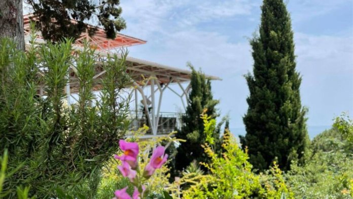 Отель расположен на возвышенности и благодаря этому с любого уголка территории и каждого, без исключения, номера открывается прекрасный вид на море. Расстояние до моря 80 м (45 ступеней). Территория отеля утопает в зелени деревьев и цветущих растений. Вечнозеленые кипарисы насыщают воздух целебными фитонцидами.
