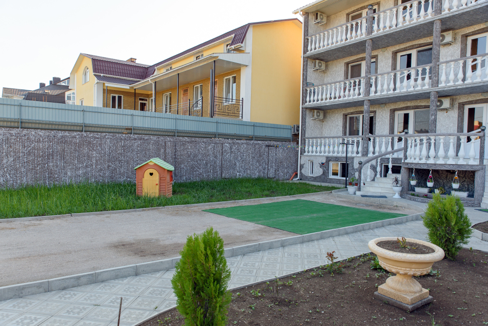 Номера в нашем новом корпусе «Вилла Людмила». У корпуса отдельный двор с маленькой детской площадкой. Корпус находится в 50 метрах от главного здания. Во дворе веранда со столиками