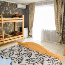 Двухкомнатный номер с двумя раздельными комнатами своим душем и санузлом. В каждой комнате небольшой тв и кондиционер. 5 спальных полноценных мест.