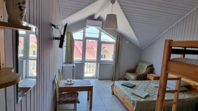 Номер на последнем этаже с мини-кухней. Номер полностью занимает пятый этаж гостевого дома. В номере не жарко.