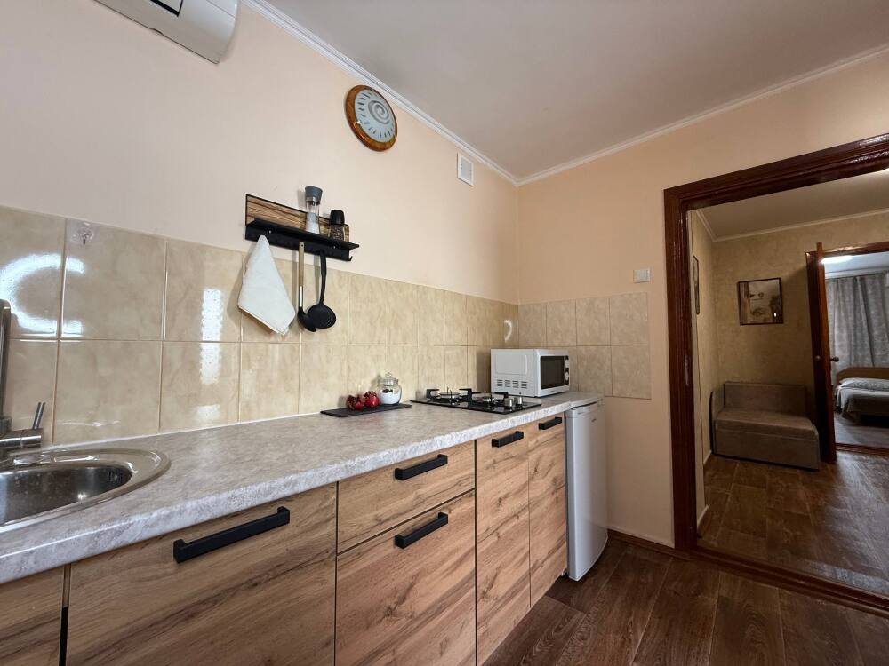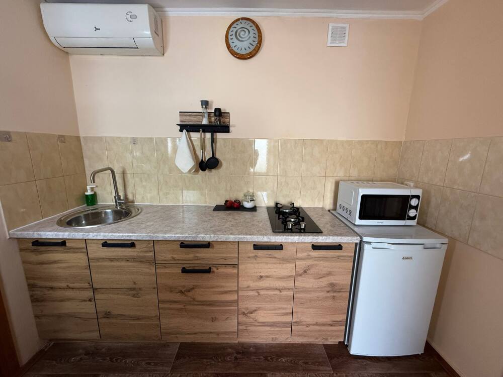 В доме две комнаты, кухня, санузел, веранда. Холодильник, телевизор, кондиционер, стиральная машина, микроволновка, фен, утюг, Wi-Fi, холодная и горячая вода постоянно, мангал.