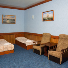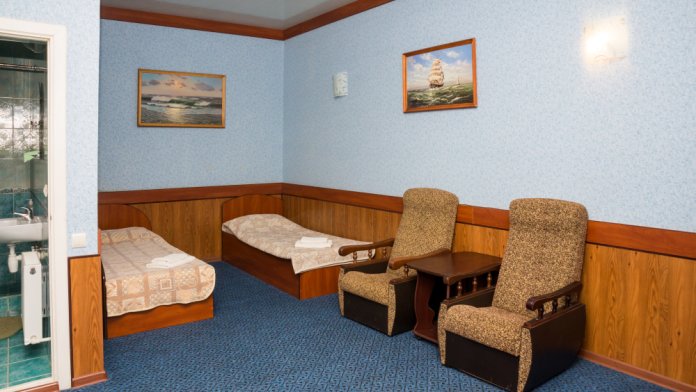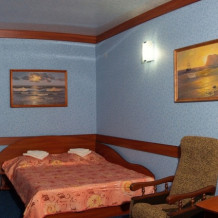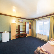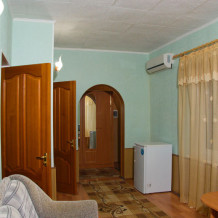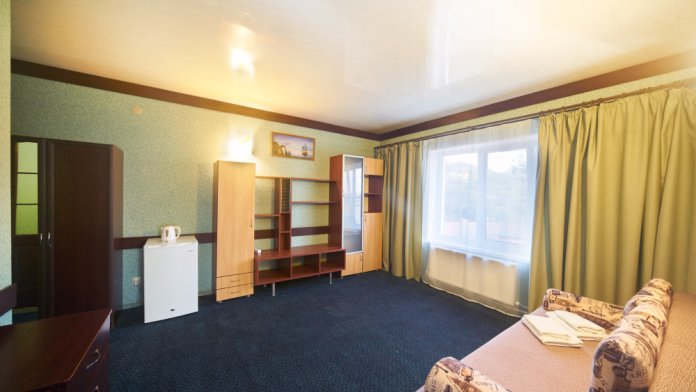Номер двухместный, находится в коттедже на втором этаже. Площадь номер 40 м квадратных. Из мебели в номере двуспальная и односпальная кровать, шкаф трюмо и комод. Также в номере есть душевая кабина , туалет, холодильник, телевизор и кондиционер