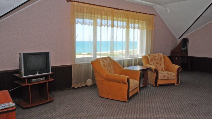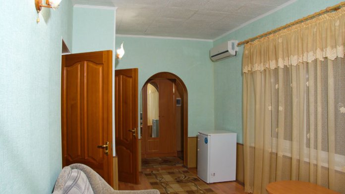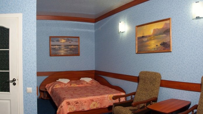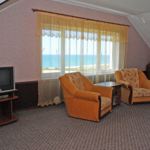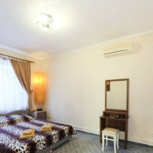 Двухкомнатный, трехместный номер 45 м.кв. В одной комнате двуспальная кровать , в другой раскладной двухместный диван. Также есть душевая кабина и туалет. Из спальни открывается красивый вид на море. В номере есть холодильник, телевизор и кондиционер.