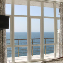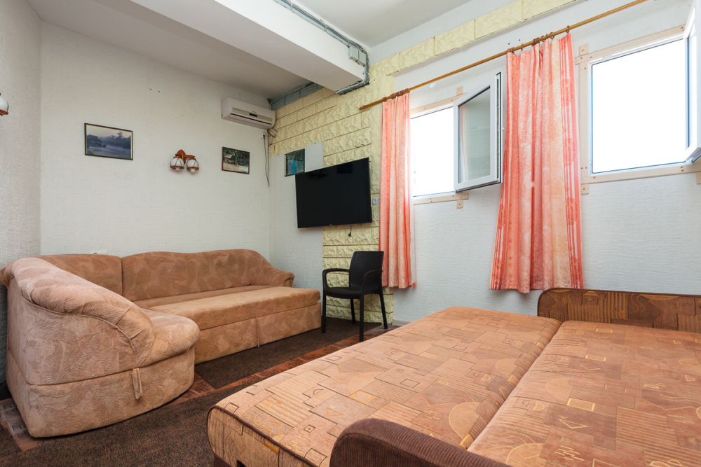 Номер представляет отдельный 3-этажный эллинг: на первом этаже - гараж. на втором - спальня (двухспальная и односпальная кровати); на третьем этаже - спальня (диван и односпальная кровать), кухня. Терраса 15 кв. м с камином и видом на море. До моря 10 м.