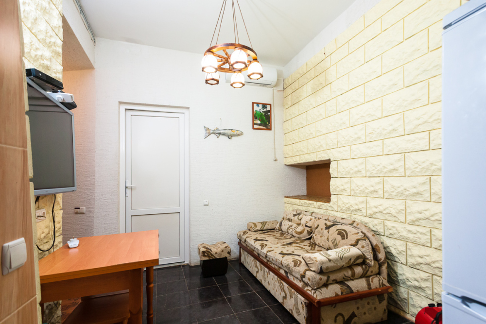 Номер 1 расположен на первом этаже, имеет отдельный вход с набережной. Состоит из двух этажей. На первом этаже - кухня, двухспальный диван. Второй этаж - отдельная спальня (двухместная кровать), в коридоре - односпальный диван