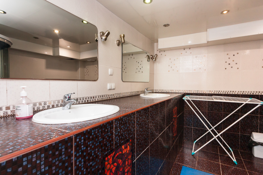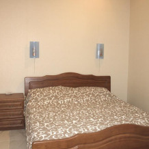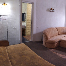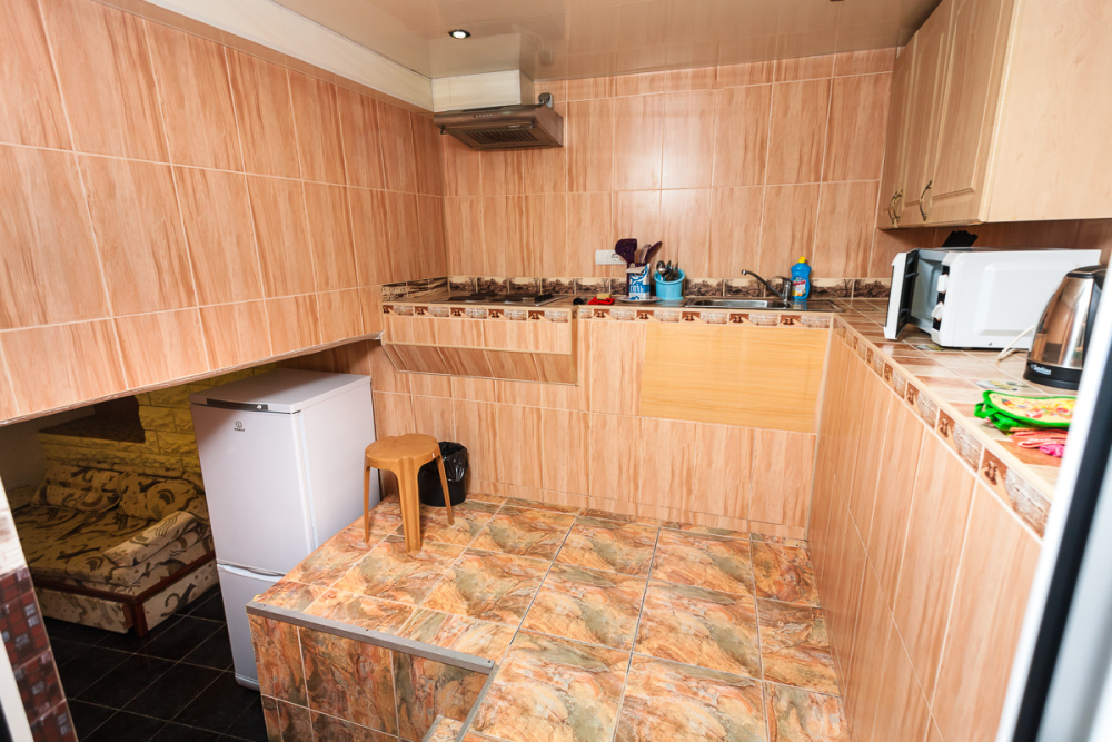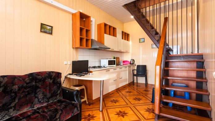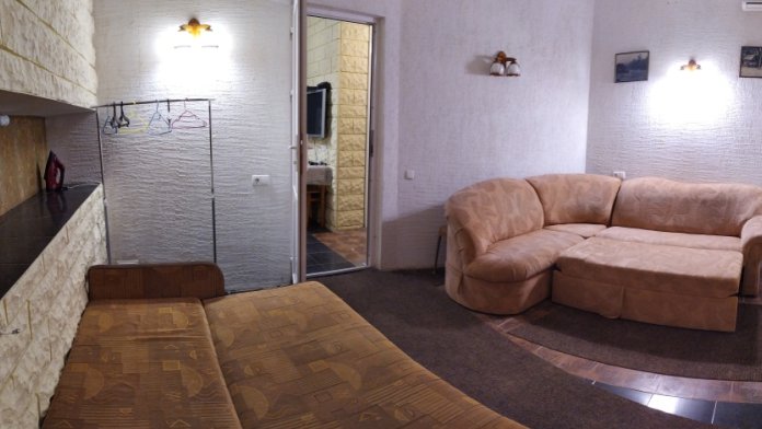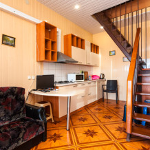 Номер 2 расположен на первом этаже и состоит из: отдельной большой спальни (двухместная кровать и двухместный диван); проходной столовой (в которой находится двухспальный диван), переходящей в кухню.