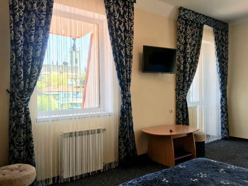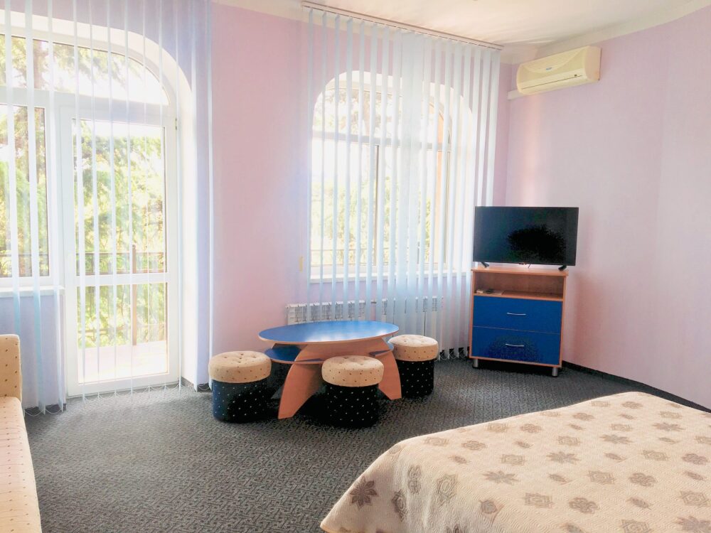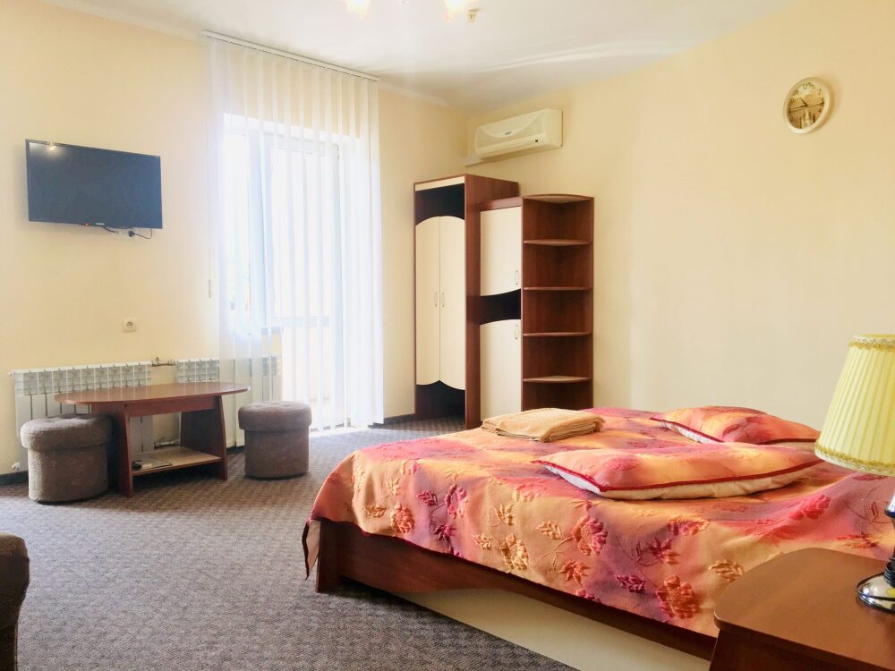 В номере: двуспальная кровать, диван, санузел с душевой кабиной, балкон (столик, стулья), кондиционер, холодильник, сейф, ж/к телевизор, wi-fi, чайник.