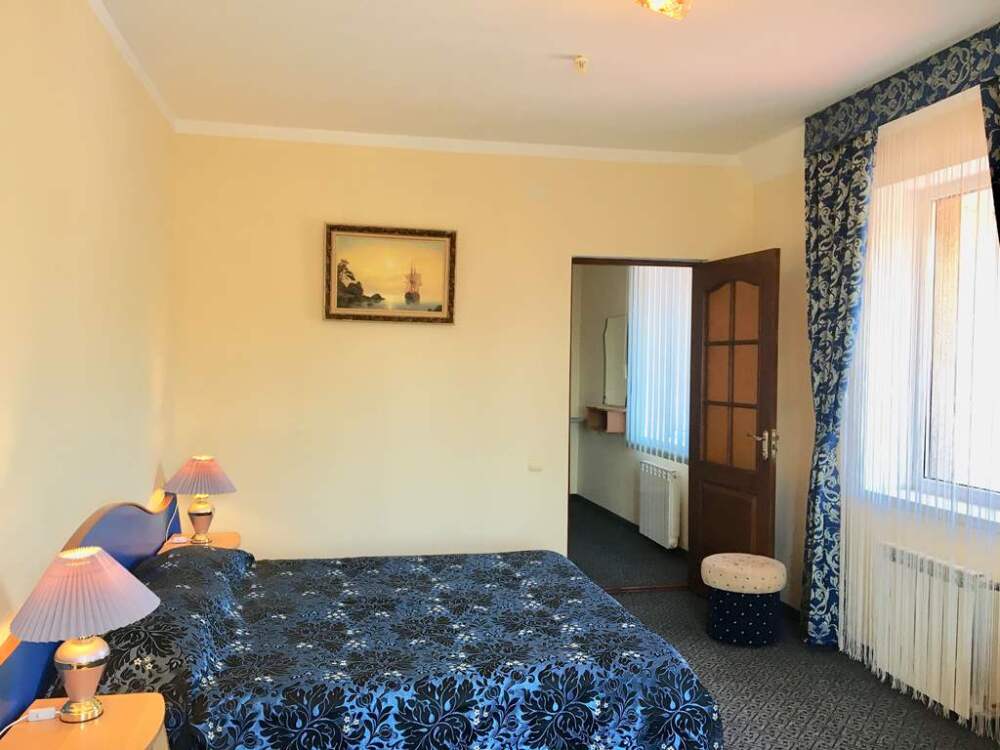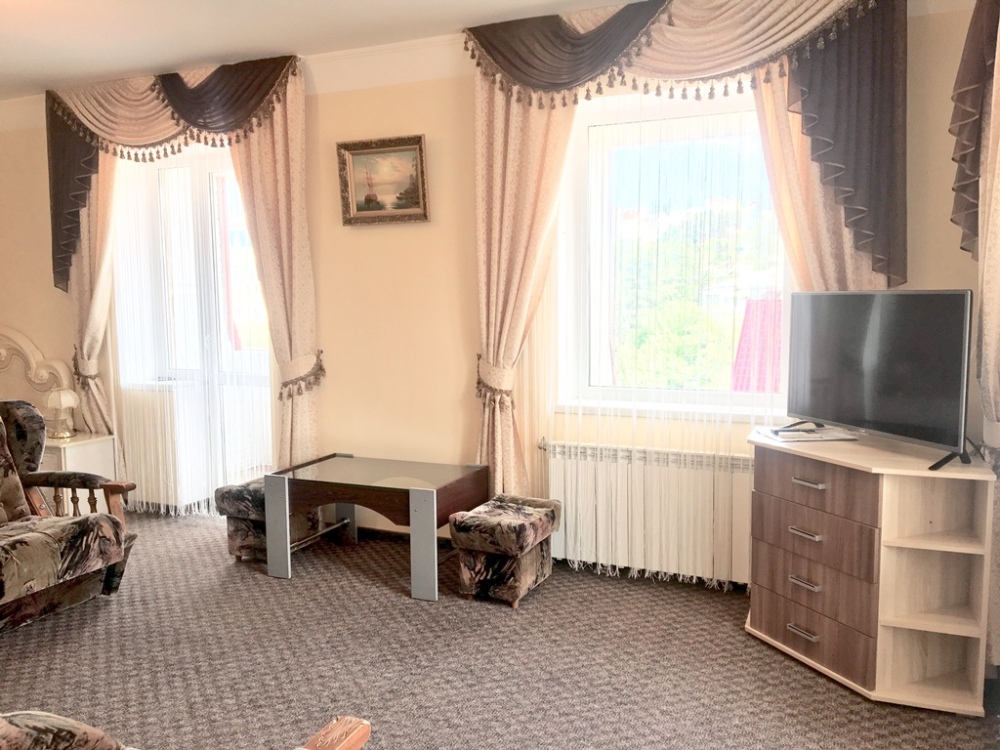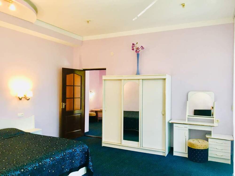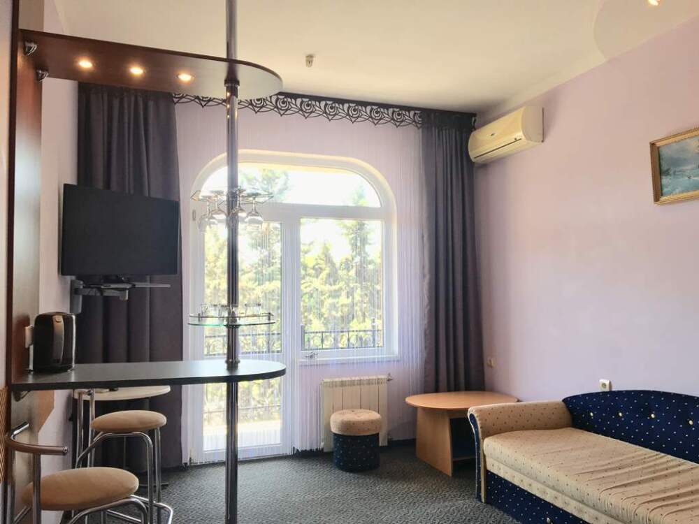 В номере: двуспальная кровать, 2 диван-кровати, санузел с душевой кабиной, балкон (столик, стулья), кондиционер (в каждой комнате), холодильник, сейф, ж/к телевизор (в каждой комнате), wi-fi, чайник.