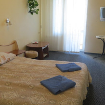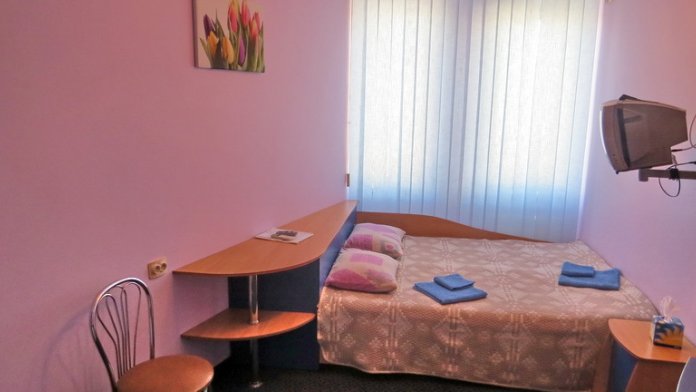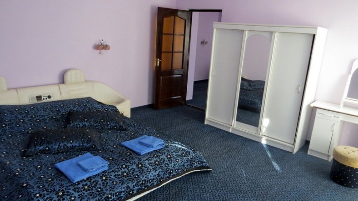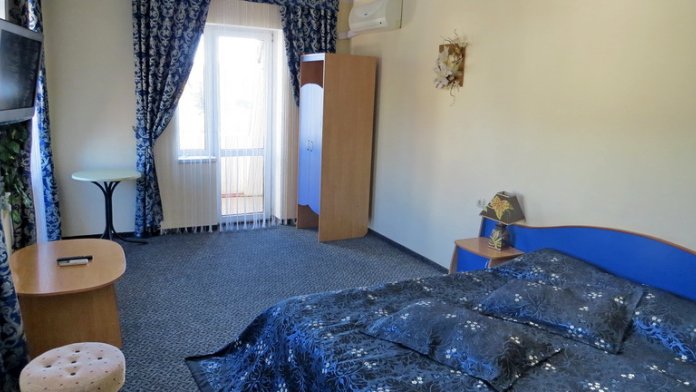 В номерах односпальные кровати, шкаф, пуфики, прикроватные тумбочки, журнальный столик.