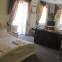 Этот люкс отличается более просторной планировкой. В номере двуспальная кровать, диван-кровать, шкаф, прикроватные тумбочки, журнальный и туалетный столик, прихожая, сейф, балкон (наличие уточнять).