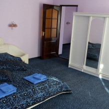 В номере двуспальная кровать, диван-кровать, шкаф, пуфики, прикроватные тумбочки, журнальный столик.