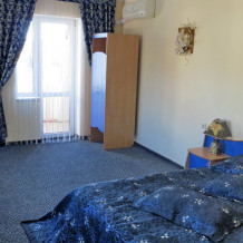 В номере односпальные или двуспальная кровати, шкаф, пуфики, прикроватные тумбочки, журнальный столик