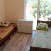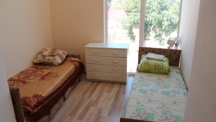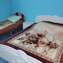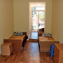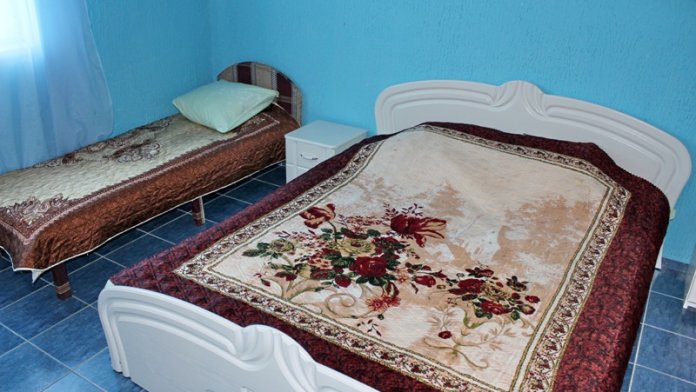 В номере односпальная и двуспальная кровати или 3 односпальные, вентилятор.