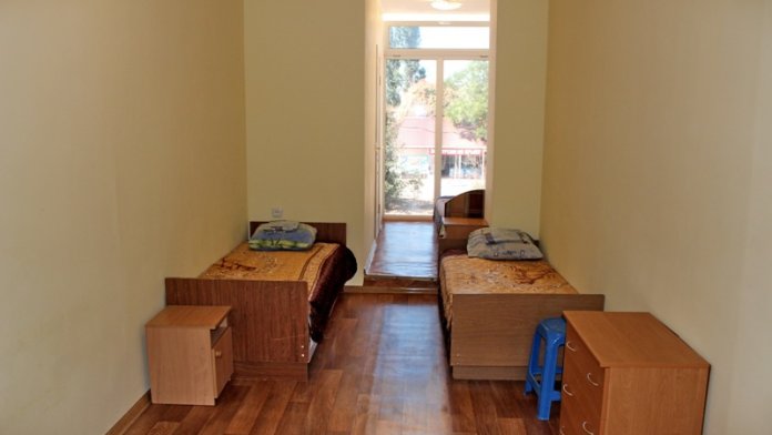 В номере односпальные или двуспальная кровати, шкаф, стулья, прикроватные тумбочки, стол, комод, вешалка, зеркало, холодильник на два номера.