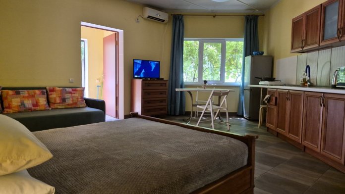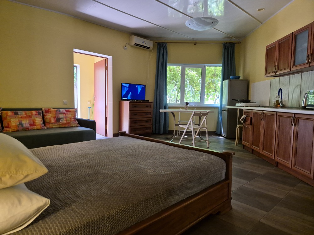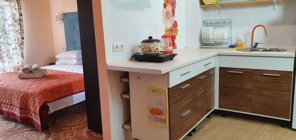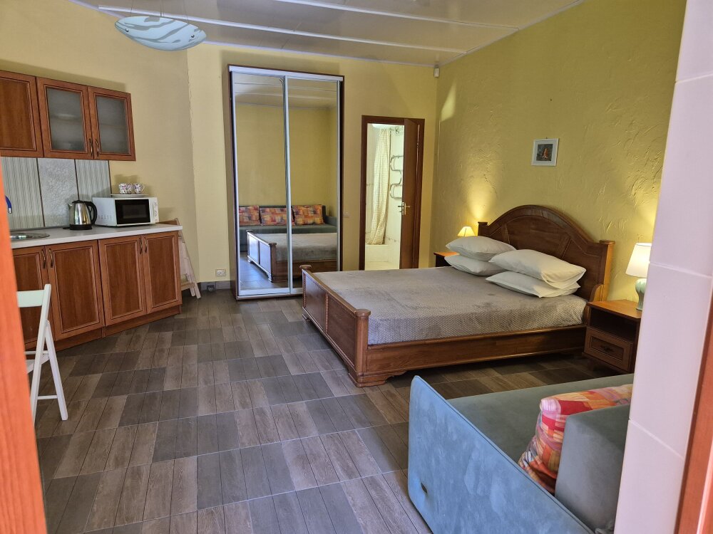 В каждой продуманной нами детали - Ваш комфорт.В комнате есть холодильник и чайник. Удобно для тех,кто предпочитает не готовить пищу самостоятельно. Возле входа столик, кресла, сушка для белья. Этот вариант размещения удобен для тех, кто ценит свое пространство и для путешествующих семей (до четырех человек).