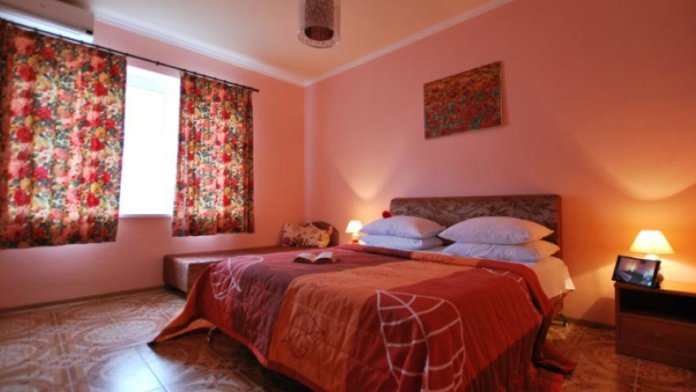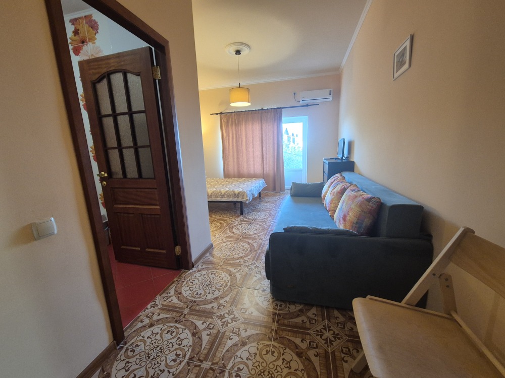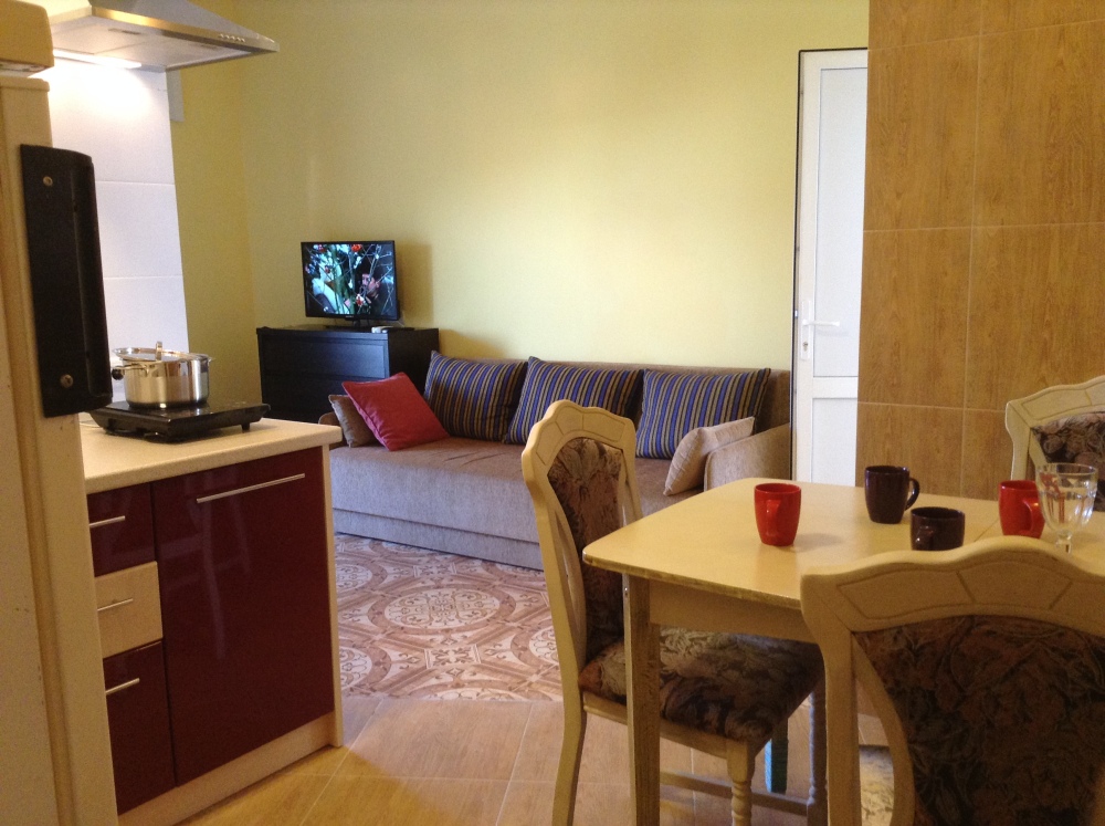 Двухкомнатный номер с двумя балконами располагается на 2 этаже каменного дома,благодаря чему здесь сохраняется прохлада в жаркие летние дни. Комнаты смежные, зона кухни (кухонный гарнитур с необходимой кухлнной утварью, вытяжка. инд.плита, холодильник, микроволновая печь, обеденных стол со стульями), совмещенный с/у.Вас не побеспокоят комары, потому что на окнах есть маскитные сетки.