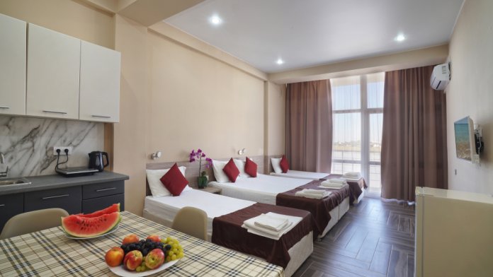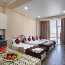 в номере четыре полноценных спальных места, прихожая, большой балкон.