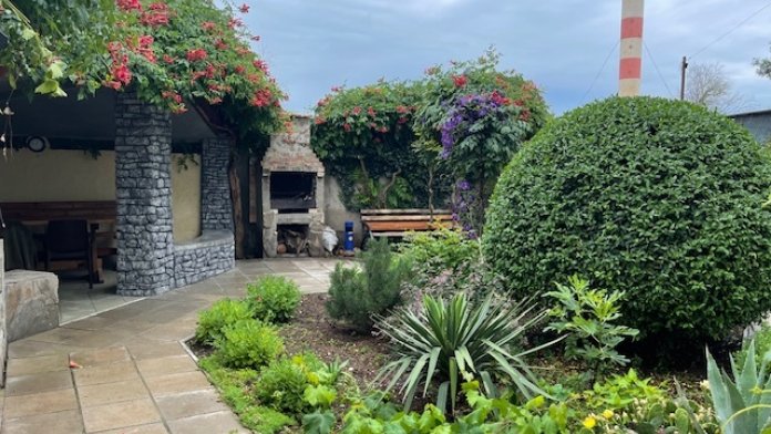 Гостевой дом оборудован летней кухней, мангалом и тремя обеденными зонами - для всех гостей. Возможность стирки в стиральной машине.